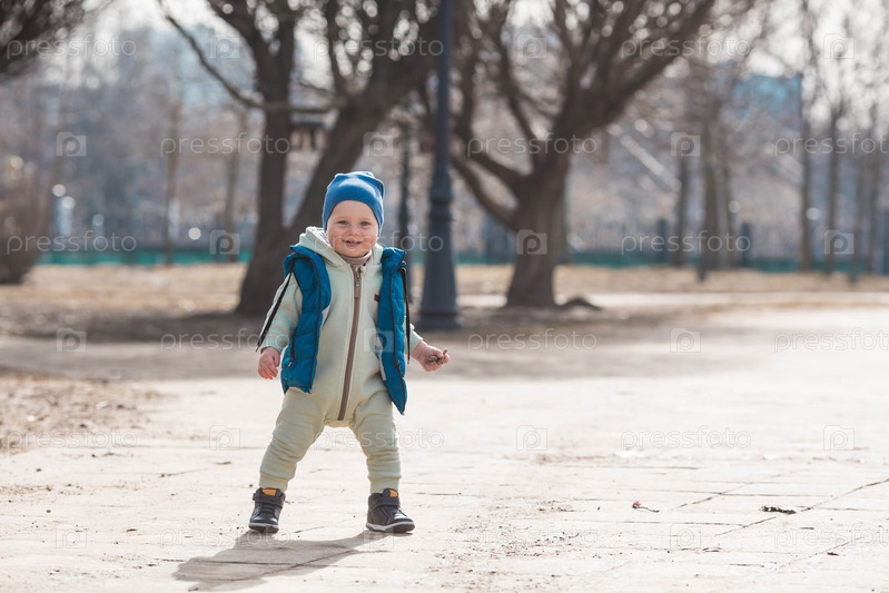 Красивый, веселый мальчик двух лет гуляет весной по улице. По парку гуляет ребенок в комбинезоне и синем жилете. Понятие родительства, детства и семьи