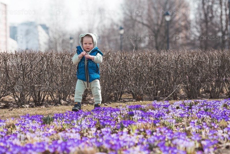 Веселый двухлетний мальчик гуляет с матерью на улице весной. Малыш играет и собирает цветы для матери в парке. Понятие родительства, детства и семьи