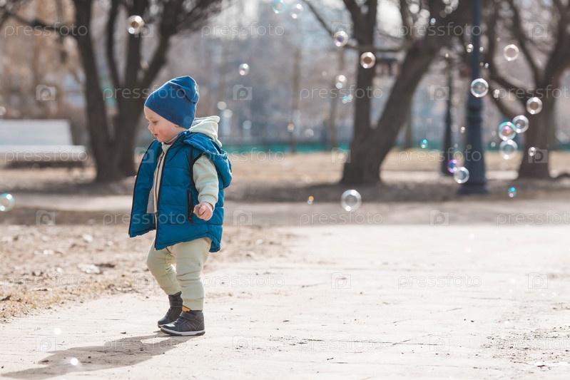 Красивый, веселый мальчик двух лет гуляет весной по улице. По парку гуляет ребенок в комбинезоне и синем жилете. Понятие родительства, детства и семьи