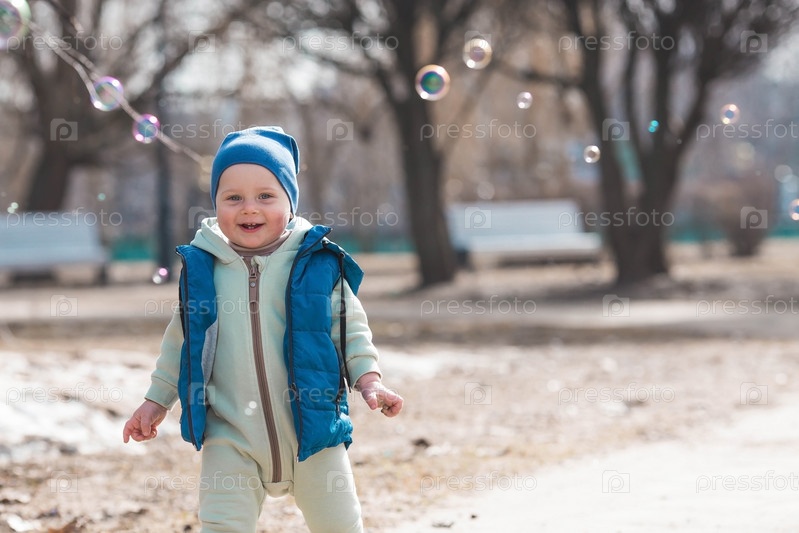 Красивый, веселый мальчик двух лет гуляет весной по улице. По парку гуляет ребенок в комбинезоне и синем жилете. Понятие родительства, детства и семьи