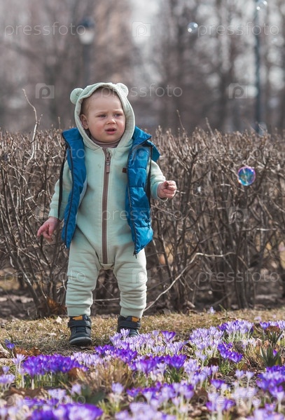 Веселый двухлетний мальчик гуляет с матерью на улице весной. Малыш играет и собирает цветы для матери в парке. Понятие родительства, детства и семьи