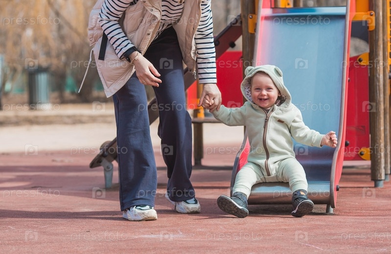 Красивый, жизнерадостный маленький мальчик двух лет гуляет с мамой на детской площадке весной. Мама катает ребенка с горки в парке. Понятие родительства, детства и семьи