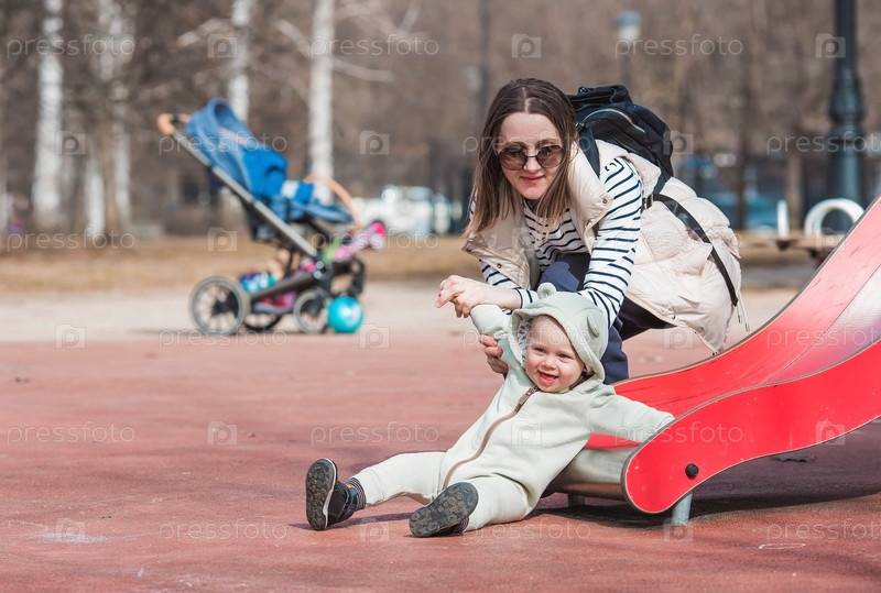 Красивый, жизнерадостный маленький мальчик двух лет гуляет с мамой на детской площадке весной. Мама катает ребенка с горки в парке. Понятие родительства, детства и семьи
