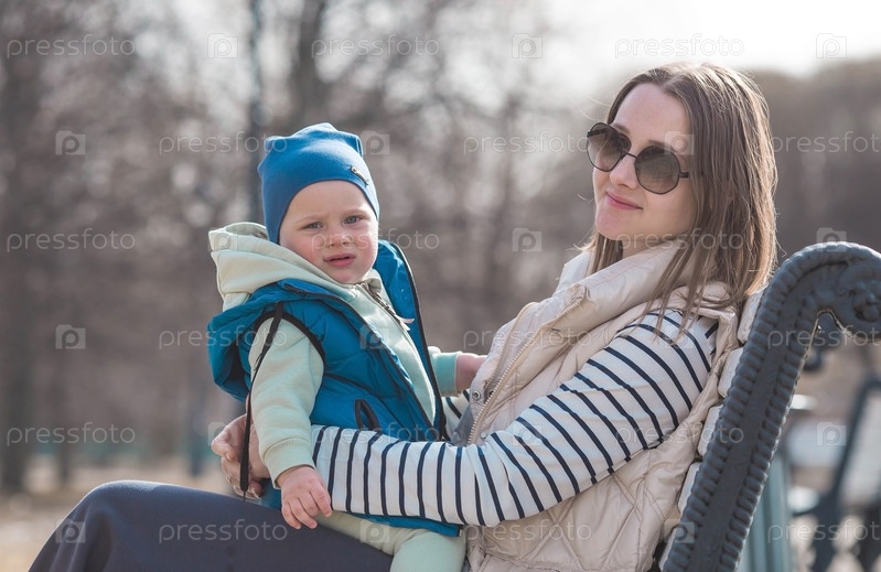 Красивый, веселый мальчик двух лет гуляет с мамой по улице весной. Малыш сидит на руках у матери на скамейке в парке. Понятие родительства, детства и семьи