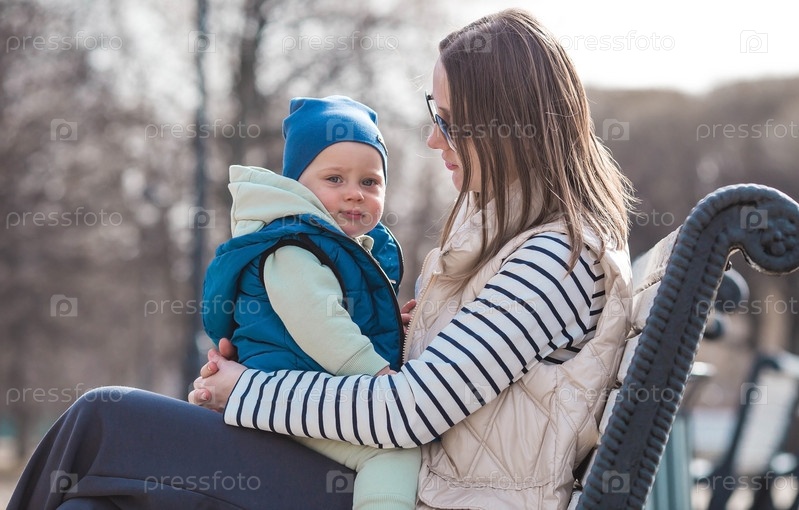 Веселый двухлетний мальчик гуляет с матерью на улице весной.Ребёнок сидит в объятиях матери на скамейке в парке.Концепция родительства, детства и семьи