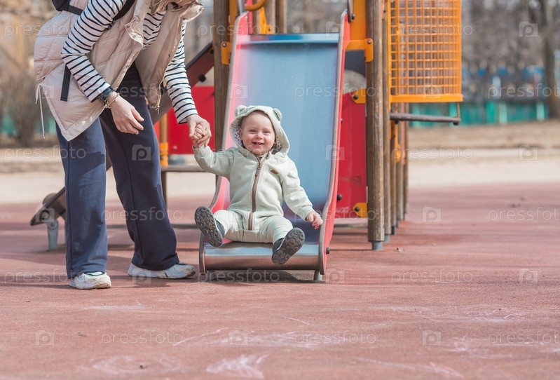 Красивый, жизнерадостный маленький мальчик двух лет гуляет с мамой на детской площадке весной. Мама катает ребенка с горки в парке. Понятие родительства, детства и семьи