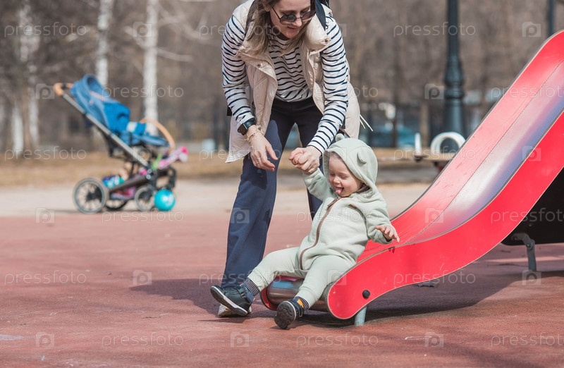 Красивый, жизнерадостный маленький мальчик двух лет гуляет с мамой на детской площадке весной. Мама катает ребенка с горки в парке. Понятие родительства, детства и семьи