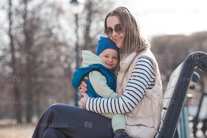 Веселый двухлетний мальчик гуляет с матерью на улице весной.Ребёнок сидит в объятиях матери на скамейке в парке.Концепция родительства, детства и семьи