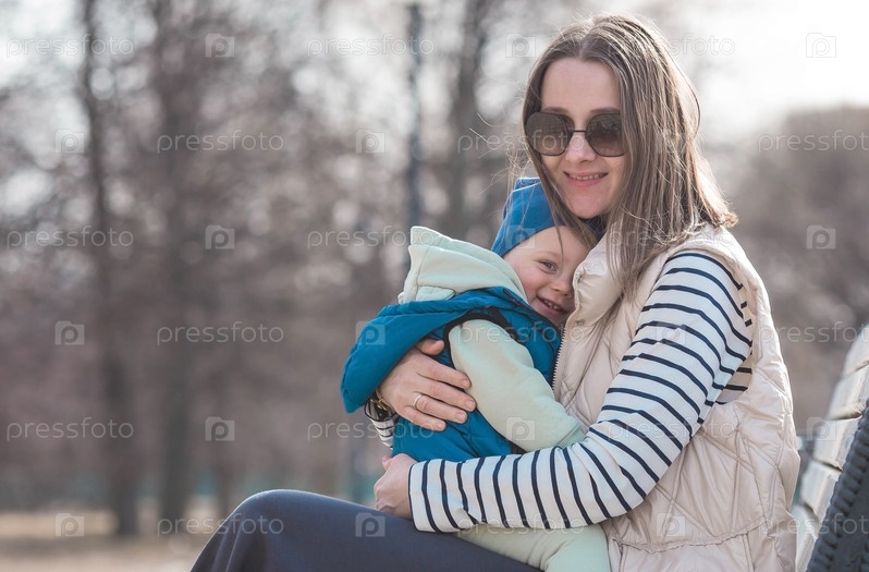 Красивый, веселый мальчик двух лет гуляет с мамой по улице весной. Малыш сидит на руках у матери на скамейке в парке. Понятие родительства, детства и семьи