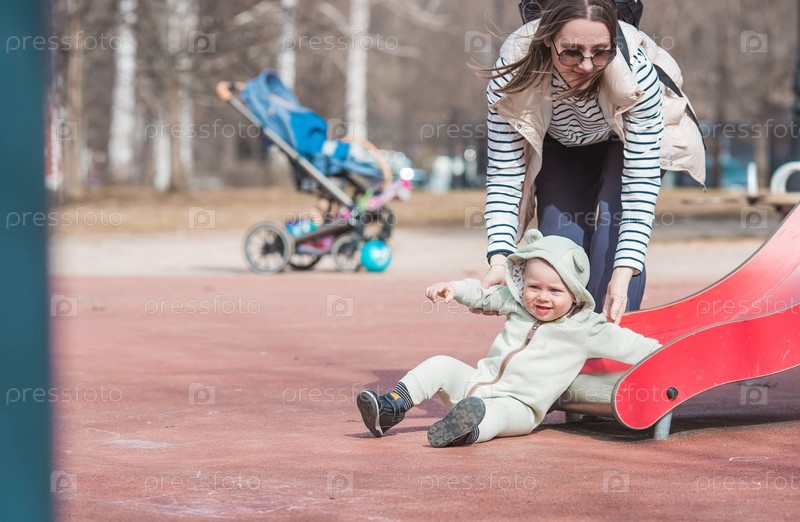 Красивый, жизнерадостный двухлетний мальчик весной гуляет с мамой на детской площадке. Мама катает ребенка с горки в парке. Понятие родительства, детства и семьи