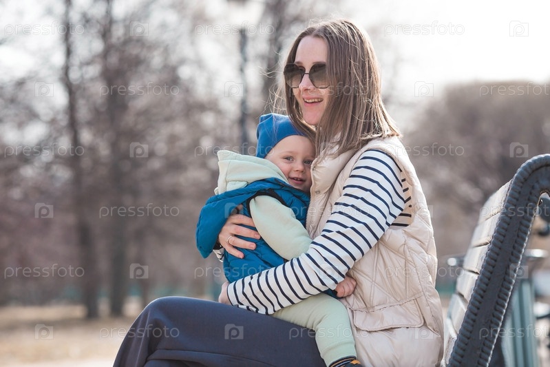 Веселый двухлетний мальчик гуляет с матерью на улице весной.Ребёнок сидит в объятиях матери на скамейке в парке.Концепция родительства, детства и семьи