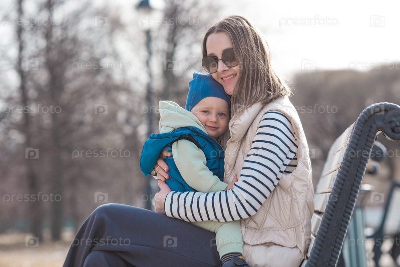 Красивый, веселый мальчик двух лет гуляет с мамой по улице весной. Малыш сидит на руках у матери на скамейке в парке. Понятие родительства, детства и семьи