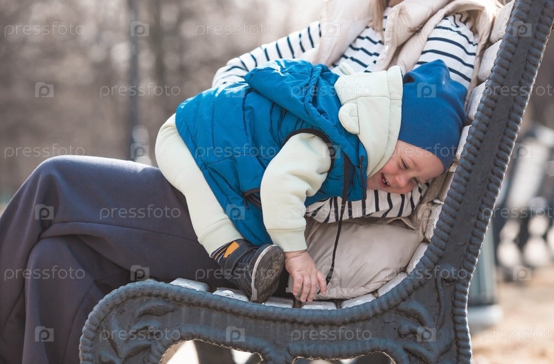 Веселый двухлетний мальчик гуляет с матерью на улице весной.Ребёнок сидит в объятиях матери на скамейке в парке.Концепция родительства, детства и семьи