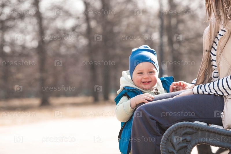 Веселый двухлетний мальчик гуляет с матерью на улице весной.Ребёнок сидит в объятиях матери на скамейке в парке.Концепция родительства, детства и семьи