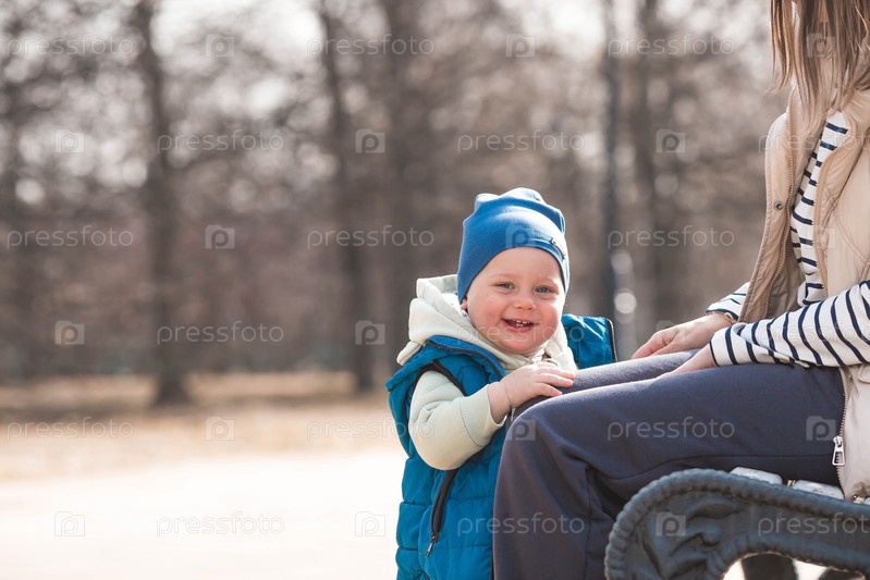 Веселый двухлетний мальчик гуляет с матерью на улице весной.Ребёнок сидит в объятиях матери на скамейке в парке.Концепция родительства, детства и семьи