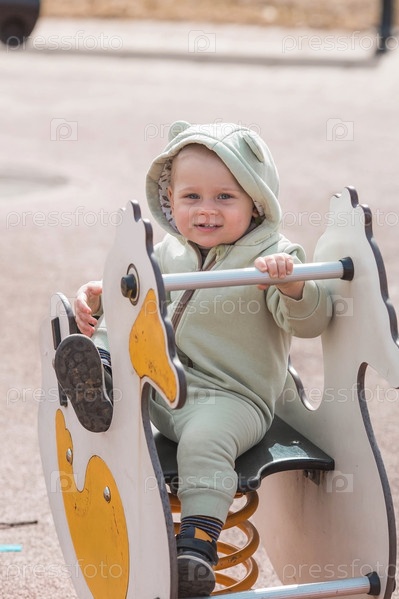 Красивый, веселый маленький мальчик двух лет гуляет весной на детской площадке. Понятие родительства, детства и семьи