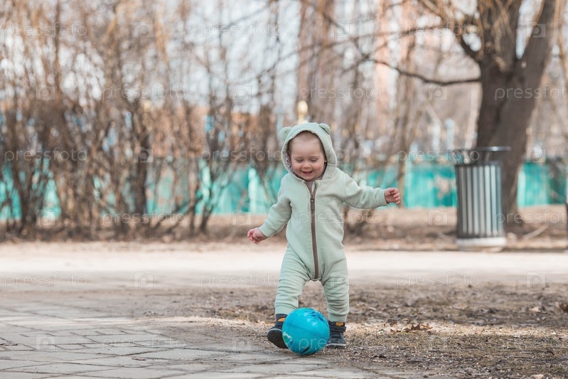 Красивый, веселый мальчик двух лет гуляет весной по улице. Мальчик в комбинезоне играет в мяч. Понятие родительства, детства и семьи