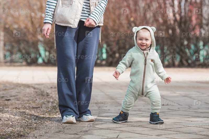 Красивый, веселый мальчик двух лет гуляет весной по улице. По парку гуляет ребенок в комбинезоне и синем жилете. Понятие родительства, детства и семьи