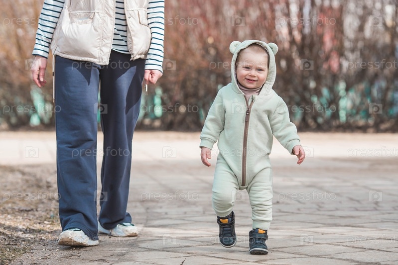 Красивый, веселый мальчик двух лет гуляет весной по улице. По парку гуляет ребенок в комбинезоне и синем жилете. Понятие родительства, детства и семьи