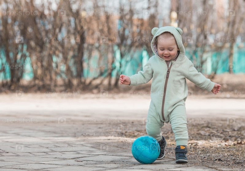 Красивый, веселый мальчик двух лет гуляет весной по улице. Мальчик в комбинезоне играет в мяч. Понятие родительства, детства и семьи