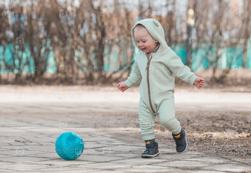 Красивый, веселый мальчик двух лет гуляет весной по улице. Мальчик в комбинезоне играет в мяч. Понятие родительства, детства и семьи