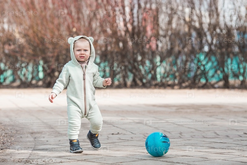 Красивый, веселый мальчик двух лет гуляет весной по улице. Мальчик в комбинезоне играет в мяч. Понятие родительства, детства и семьи