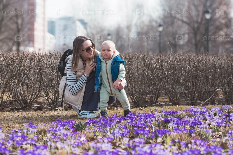 Красивый, веселый мальчик двух лет гуляет с мамой по улице весной. Малыш играет на фоне весенних цветов в парке. Понятие родительства, детства и семьи
