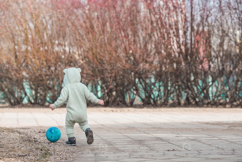 Красивый, веселый мальчик двух лет гуляет весной по улице. Мальчик в комбинезоне играет в мяч. Понятие родительства, детства и семьи