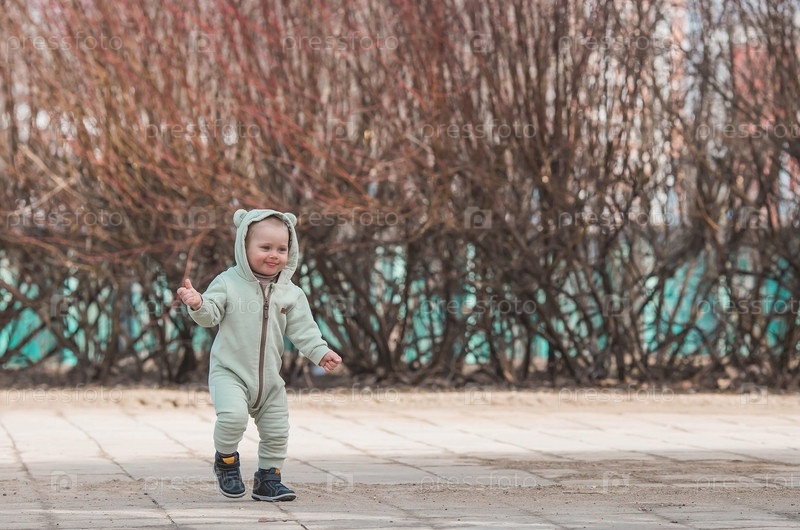 Красивый, веселый мальчик двух лет гуляет весной по улице. По парку гуляет ребенок в комбинезоне и синем жилете. Понятие родительства, детства и семьи
