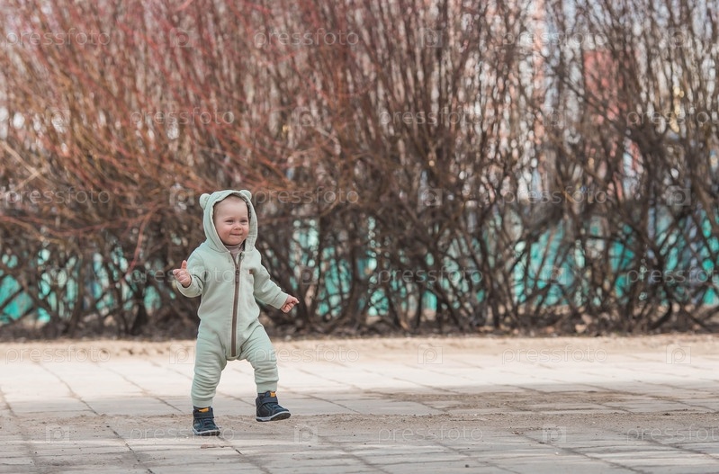 Красивый, веселый мальчик двух лет гуляет весной по улице. По парку гуляет ребенок в комбинезоне и синем жилете. Понятие родительства, детства и семьи