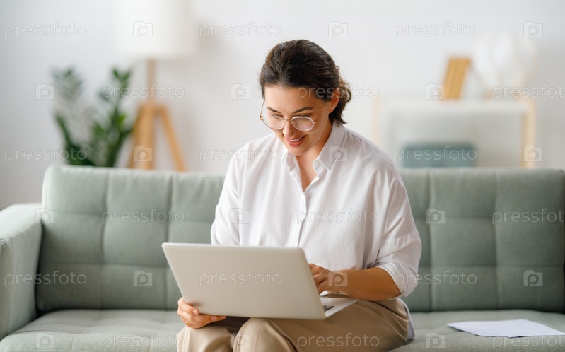 Женщина работает дома за ноутбуком