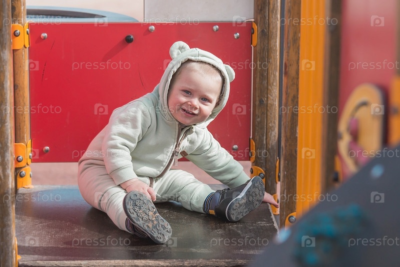Красивый, веселый маленький мальчик двух лет гуляет весной на детской площадке. Понятие родительства, детства и семьи