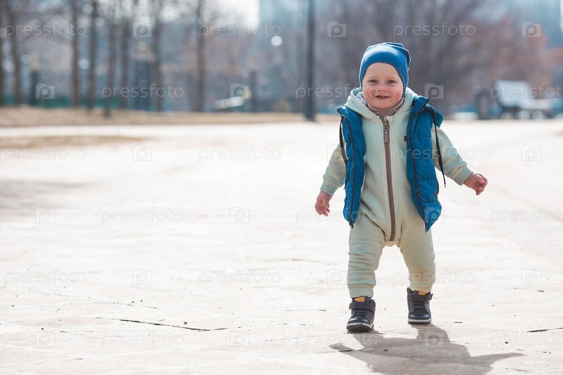 Красивый, веселый мальчик двух лет гуляет весной по улице. По парку гуляет ребенок в комбинезоне и синем жилете. Понятие родительства, детства и семьи