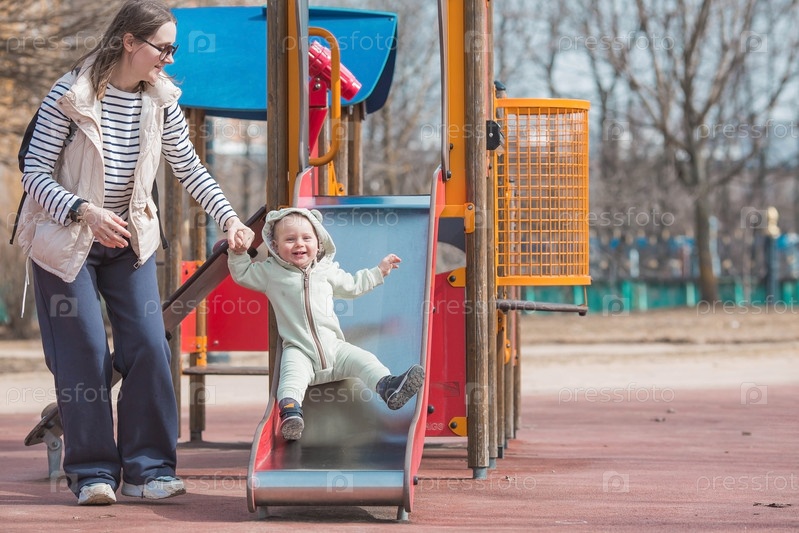 Красивый, жизнерадостный маленький мальчик двух лет гуляет с мамой на детской площадке весной. Мама катает ребенка с горки в парке. Понятие родительства, детства и семьи