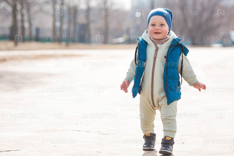 Красивый, веселый мальчик двух лет гуляет весной по улице. По парку гуляет ребенок в комбинезоне и синем жилете. Понятие родительства, детства и семьи