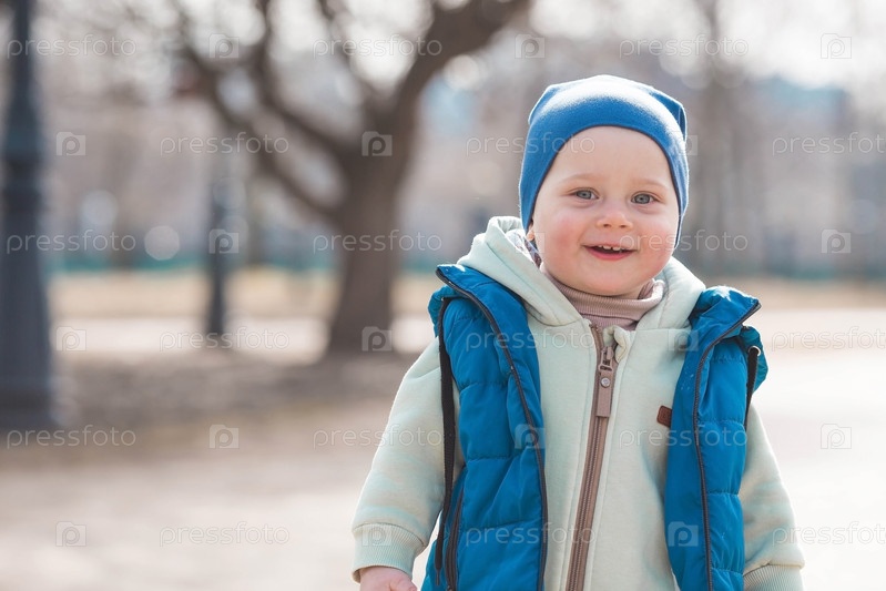 Красивый, веселый мальчик двух лет гуляет весной по улице. По парку гуляет ребенок в комбинезоне и синем жилете. Понятие родительства, детства и семьи