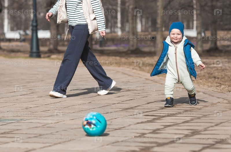 Красивый, веселый мальчик двух лет гуляет весной по улице. Мальчик в комбинезоне играет в мяч. Понятие родительства, детства и семьи
