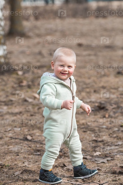 Красивый, веселый мальчик двух лет гуляет весной по улице. По парку гуляет ребенок в комбинезоне и синем жилете. Понятие родительства, детства и семьи