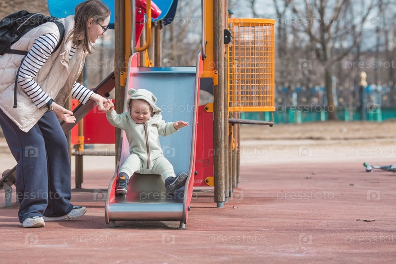 Красивый, жизнерадостный маленький мальчик двух лет гуляет с мамой на детской площадке весной. Мама катает ребенка с горки в парке. Понятие родительства, детства и семьи