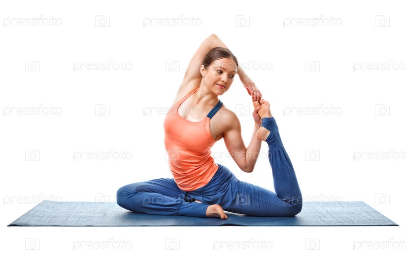 Женщина занимается йогой асана Эка пада капотасана
