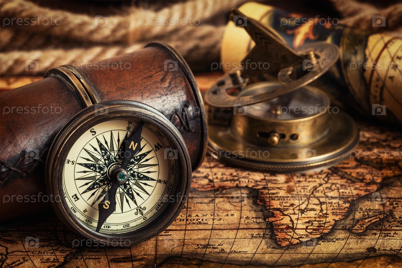 Фон концепции навигации по географии путешествий - старый винтажный ретро-компас с солнечными часами, подзорной трубой и веревкой на карте древнего мира