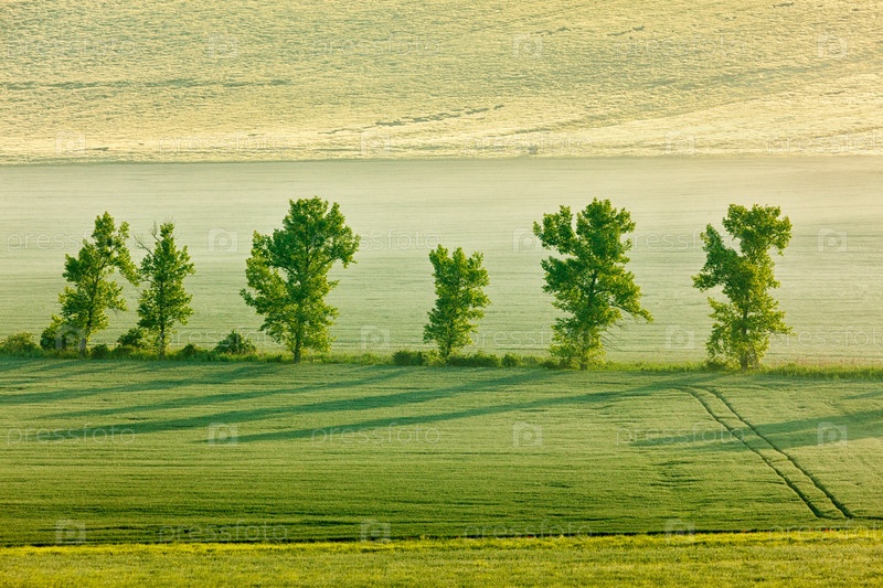 Моравский холмистый пейзаж с деревьями утром