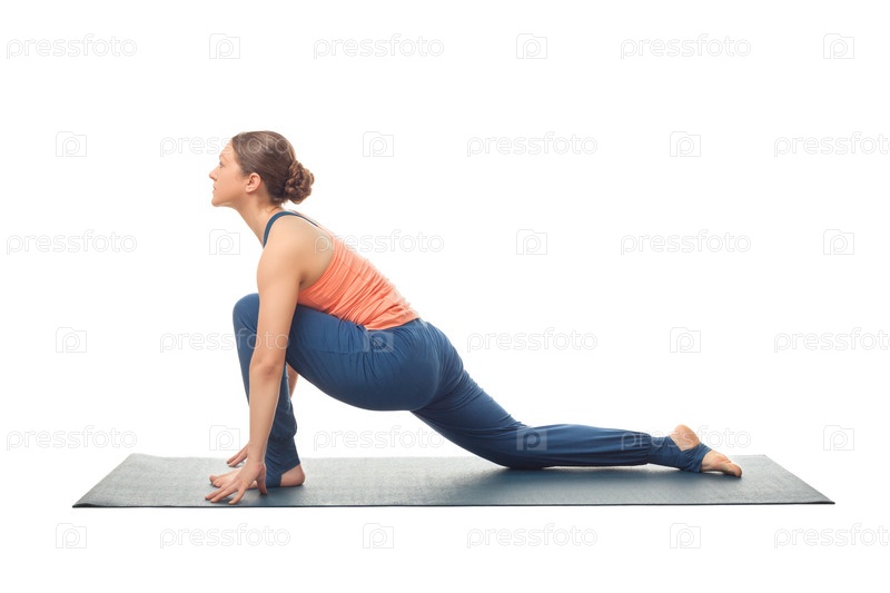 Красивая спортивная женщина-йогиня практикует асану йоги Анджанеясана - поза низкого полумесяца в Сурья Намаскар, изолированная на белом