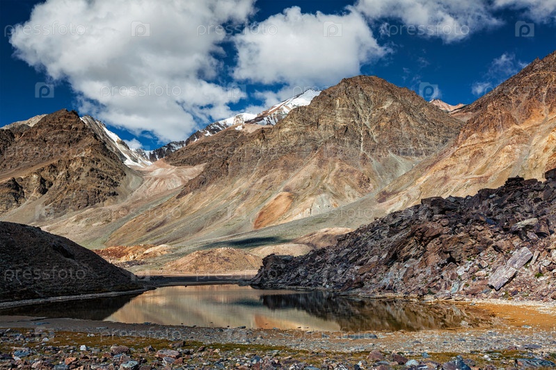 Гималайский пейзаж с горным озером в Гималаях вдоль шоссе Манали-Лех. Химачал-Прадеш, Индия
