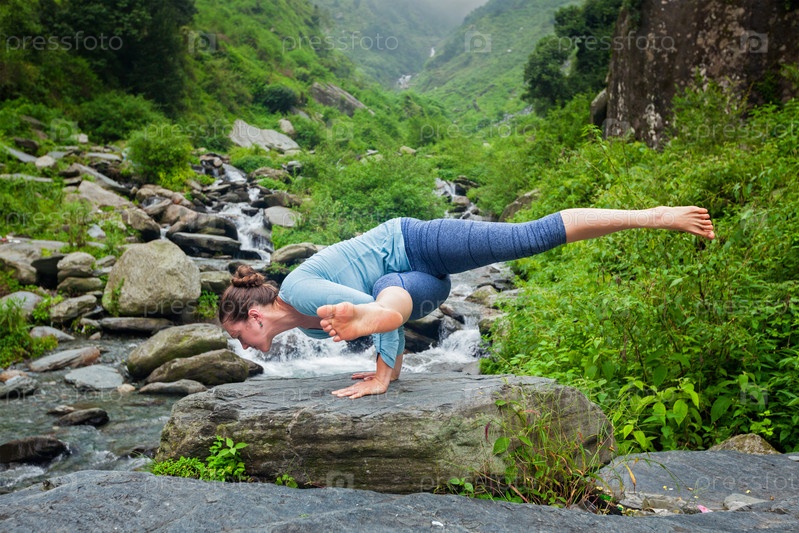 Женщина занимается йогой на открытом воздухе у тропического водопада