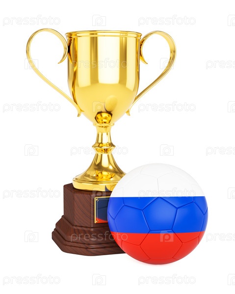 Золотой кубок и футбольный мяч с флагом России