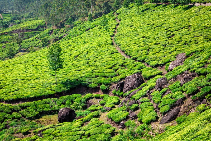 Керала Индия фон путешествия - плантации зеленого чая в Муннаре с низкими облаками, Керала, Индия - туристическая достопримечательность