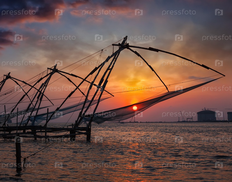 Туристическая достопримечательность Кочи - китайские рыболовные сети на закате. Форт Кочин, Кочи, Керала, Индия
