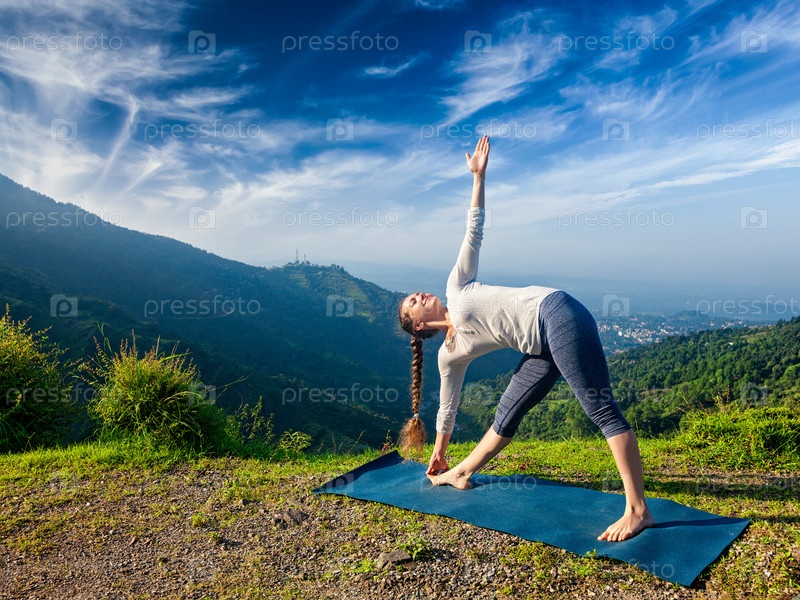 Женщина, занимающаяся асаной аштанга-виньяса йоги Уттхита триконасана - вытянутая поза треугольника на открытом воздухе в горах утром