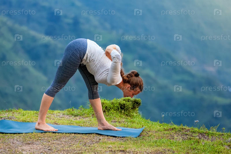 Женщина делает асану йоги Аштанга Виньяса Паршвоттанасану с интенсивной боковой растяжкой на открытом воздухе в горах Гималаи. Химачал-Прадеш, Индия